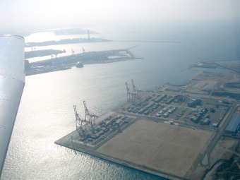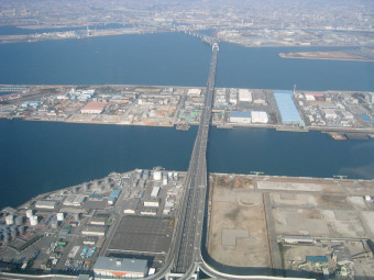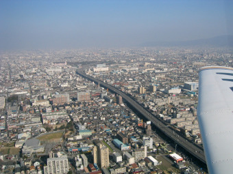阪神高速湾岸線です。中央左端には北港のヨットハーバーが見えています。写真の上にある川が新淀川です。ここには見えていませんが、真下にユニバーサル・スタジオ・ジャパンがあるんですが・・・ |