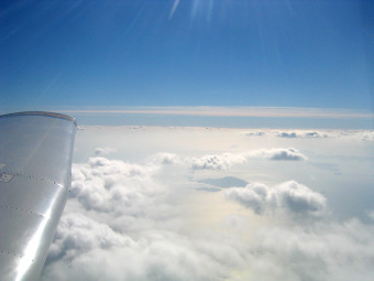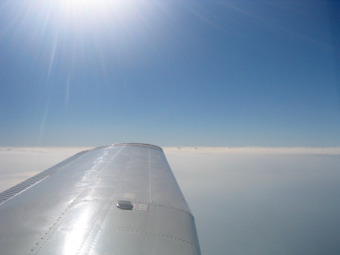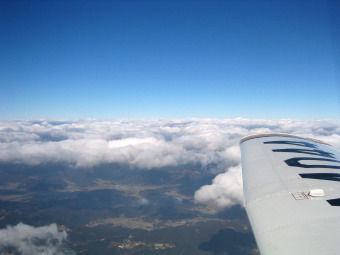 今日は5,000フィートあたりに雲が少し。そこから上はご覧の通りの青空です。下の高度はガスっている感じですよね。巡航高度の8,500フィートで飛行中。 |