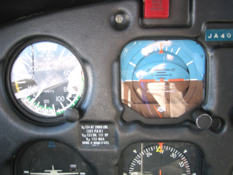計器盤中央に位置している姿勢指示器(右)と速度計(左)です。姿勢指示器は疑似水平線で、茶色い部分が地上で青い部分が空をイメージしています。オレンジ色の棒が飛行機の状態を示しています。この状態で水平飛行をしている(飛行機と地平線が平行している)ということです。 |