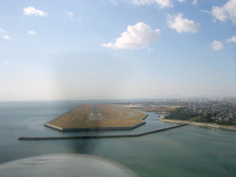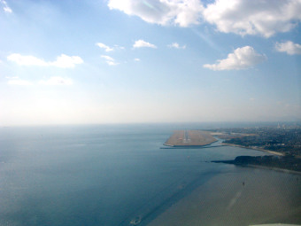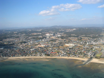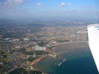 正面には滑走路が見えています。ここは白土海水浴場です。右の方に海に流れ込んでいるのは浜田川です。