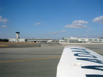 駐機場に向かってタキシング。宇部空港のターミナルビルの前を横断していきます。 |