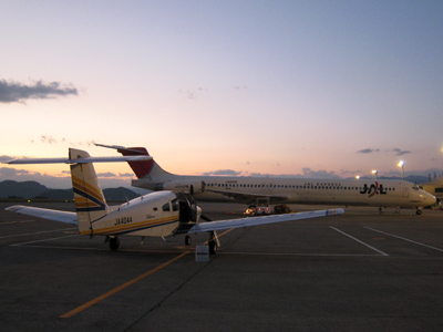 だんだん涼しくなってきた。高知の夕方もひんやりとする。日没直後の空港はとても静かだ。我が機の前には日本航空のMD型機が簡易整備を受けている模様。エンジン音もない広大な空港は、なんとなく落ち着く。