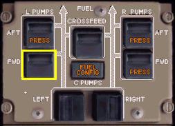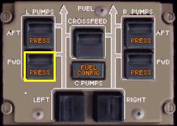 下のようにAPUを始動させると左ウィングのフォワードポンプのPRESSライトが消灯し、APUに燃料が供給されていることがわかります。