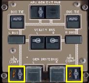 右のBUS・TIEボタンを押し、ライト・AC・バスに電力を供給します。