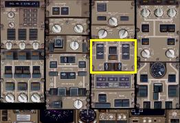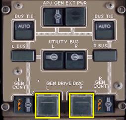 左右の両エンジンのジェネレータ・ドライブ・ディスコネクト・スイッチがOFFになっていることを確認します。このスイッチは安全のためのカバーが付けられています。発電機のオーバーヒート、または正常に動作しない場合、このジェネレーター・ドライブ・ディスコネクト・スイッチを使うことにより発電機がエンジンから切り離されます。767PICではこのスイッチをダブルクリックすることにより動作させます。安全のためシングルクリックでは動作しません。このスイッチをダブルクリックして発電機のドライブシャフトをエンジンから切断すると