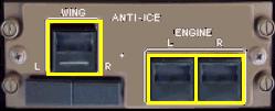 1個のウィング・アンティ・アイス・スイッチと2個のエンジン・アンティ・アイス・スイッチが全てオフになっていることを確認します。