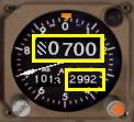 バロメトリック・セティング・ウィンドウにもしATISが得られている場合はその情報にもとずいて最新のQNHをセットします。そしてアルティテュード・ポインターの指針とデジタル・カウンターの数値が旭川空港のフィールド・エレベーション