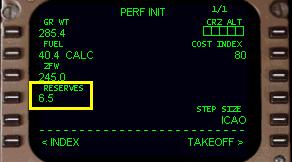 オルタネート・フュエル(代替空港への燃料)とリザーブ・フュエル(予備燃料)の合計を1000ポンド単位で入力します。ここでは