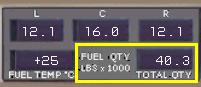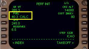| FO | フュエル・クォンティティー・・・・・フォーティー・タウザンド・スリー・ハンドレッド FMC の PERF INIT ページとオーバーヘッド・パネルで燃料を確認します。 |