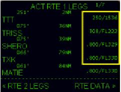 LEGS ページはそれぞれのウェイポイントのスピードと高度データを画面の右側のそれぞれのウェイポイントの横にリスト表示します
