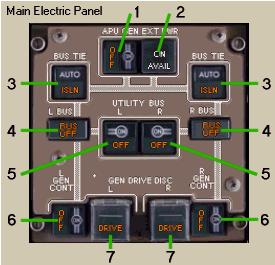 1- APU Generator Control Switch: It controls the status of the APU GEN breaker.
