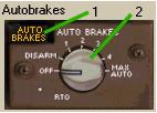 | DISARM | - | Disengages autobrakes. オートブレーキをディスエンゲージします Application of manual brakes or placing the Autobrake selector to DISARM disengages the autobrakes. マニュアルブレーキまたはオートブレーキセレクターを DISARM にしたときの適応はオートブレーキはディスエンゲージされます |