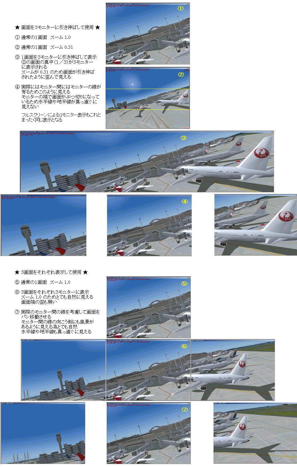 3画面とも縁の細い液晶モニターなどを使用していればそれほどでもありませんが、CRTモニターや縁の太い液晶モニターの場合にモニター間の縁のため旋回中の斜めの地平線、水平線がずれてしまいます。