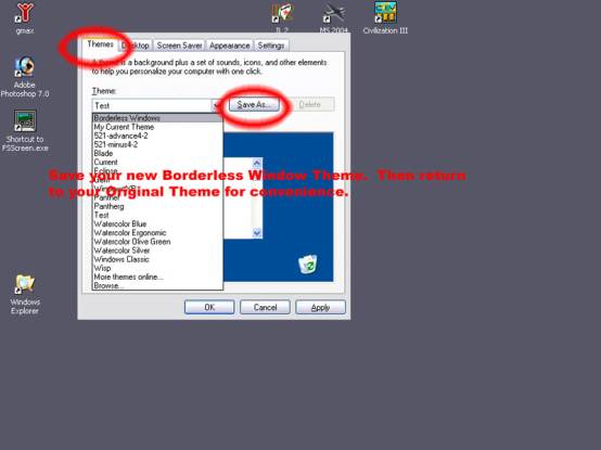 これでウィンドウの枠の無い表示がウィンドウテーマとして保存されました。