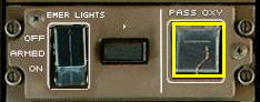 ガードがかかっておりONライトが消灯していることを確認します。スイッチにガードがかかったノーマル・ポジションであれば、キャビン・アルティテュード(客室高度)が14000フィートに達すると酸素マスクが自動的に乗客の目の前に出てきます。もし自動的にマスクが出てこない場合には、パイロットはこのガードを開けて手動でスイッチをオンにして乗客の酸素供給システムを作動させてマスクを出します。