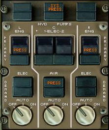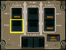 現在APUを運転中ですので下のように左ウィングのフォワードポンプのPRESSライトが消灯し、APUに燃料が供給されていることがわかります。