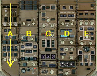 オーバーヘッドパネルの操作を行うには順番があります。まずオーバーヘッドパネルを左側の機体後方側(AFT側)から前方へ。そして右側の列も同じような順序で行っていきます。これはチェックや操作に抜けがないようにするためです。