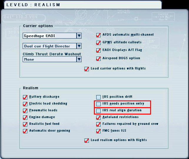 チェックを入れてリアルモードにすると、IRUをNAVに合わせた後、正しく位置情報を設定しなかったばあいはタイムアップ後にアライン・ライトが点滅し、位置情報のアラインが正しく完了しなかったことを知らせます。