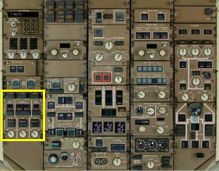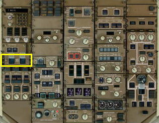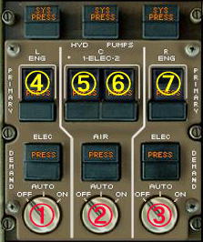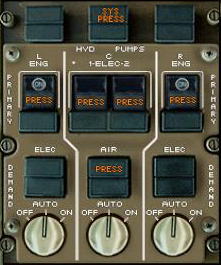中央の電気駆動プライマリー・ポンプは2つありDEこのうちの右側のポンプはスイッチをONにしていても他の油圧用の電気駆動ポンプが全てONになっていて、供給する電源系統が1つしかない場合には電力の節約のためPRESSライトが点灯しポンプは動作しません。どれか1つでも電気駆動ポンプをOFFにするとPRESSライトが消えポンプが働きます。