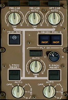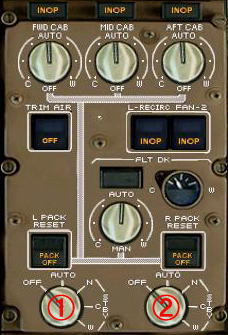 2 つの空調パックは温度調整された空気をキャビンや与圧システムへ供給します。空調パックはそれぞれのニューマティックシステムからのブリードエアを使って動作します。パックの制御は