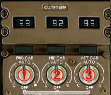 OFF ライトが点灯します。パックは客室温度コントローラにより設定される最も涼しい区画の要求を満たす気温を作り出すよう制御します。トリムエアシステムは他の区画の要求する気温に調整する必要がある場合、暖かい空気を供給します。