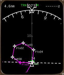 EHSI の 「PLAN」 モードは外側の目盛は機体のノーズの方角を示していますが、ルート表示はそれとはまったく関係無く、いつも北が上になる表示になっています。「MAP」