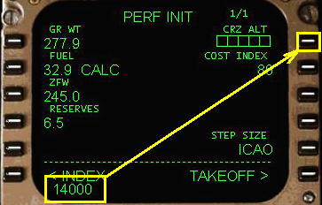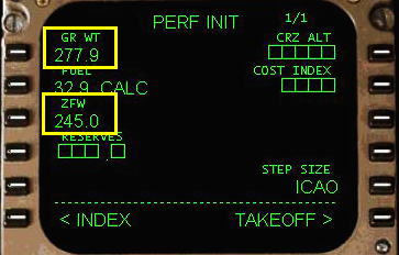 ( ZFW ) からPERF INIT ページのプログラミングを始めます。これは飛行機の重量で、燃料を除いて荷重をプラスしたものです。FS2004を起動する前に燃料登載および乗客、積荷の設定をしましたね。このときに控えておいた
