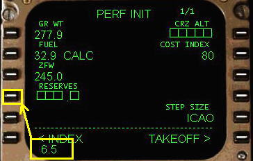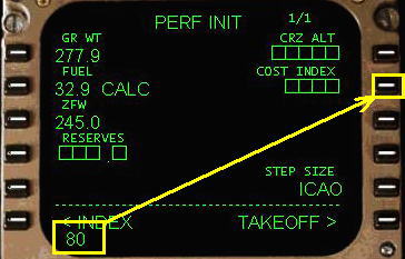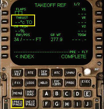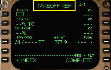 THRUST 温度入力があります。これはアシュームド・テンペレチャー(仮定温度)とよばれ、リデュースド・スラスト・テイクオフ(減格推力離陸:離陸重量が軽く外気温度が低い時に離陸推力を減らして行う離陸)のための温度設定です。ここにアシュームド・テンペレチャーを入力するとよこに