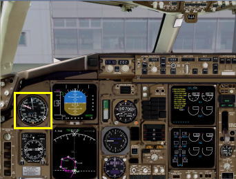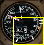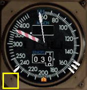 設定された V1 スピードを対気速度計のエアスピード・バグで指定しておきます。対気速度計の左下の部分をクリックするとエアスピード・リファレンス・バグ(白いマーカー)とエアスピード・コマンド・バグ(オレンジのマーカー)が自動で展開されます。この自動展開は地上ではテイクオフ・スピード、上空ではアプローチ・スピードに展開されます。