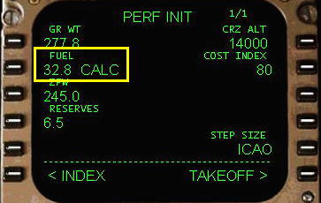 | FO | フュエル・クォンティティー・・・・・サーティー・タウザンド・ツー・ハンドレッド FMC の PERF INIT ページとオーバーヘッド・パネルで燃料を確認します。 |