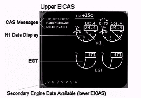 上部のEICAS CRTは、エンジンデータN1とEGT(排気ガス温度)の脇に、CASメッセージをを表示します。