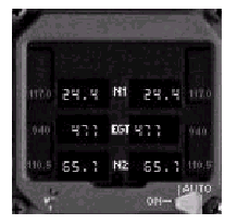 | EEC Switches - ON EECスイッチ−ON Ignition Selector - 1, BOTH or 2 (1=odd days, 2=even days, BOTH= cold weather start) 点火装置セレクタ−1、BOTHまたは2(1=奇数日、2=偶数日、BOTH=寒冷気候スタート時、とします) Start Selectors - AUTO スタートセレクタ−AUTO Fuel Cutoff Switches - OFF 燃料カットオフスイッチ−OFF TRP - Select TO and 1 or 2 for derate climb (if desired) TRP−TO及びderate climbを行う場合は、1または2 Standby Engine Display - AUTO 予備エンジン表示−AUTO |
