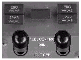スロットルクァドラントにある燃料コントロールスイッチは、それぞれのエンジンについている2つのバルブ(エンジンバルブとスパーバルブ)をコントロールします。