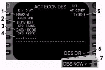 T/Dを過ぎてVNAVキーを押すと、VNAV DESページが表示されます。