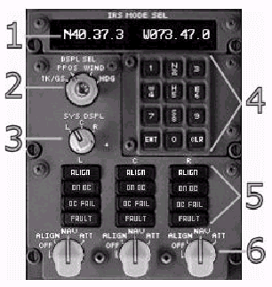 IRSモードセレクタノブ:該当するIRUの操作モードを制御します。(注:図では6となっている)