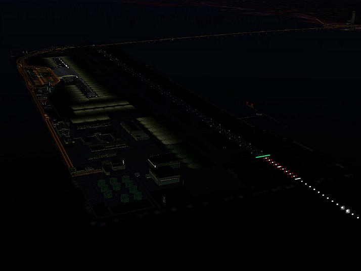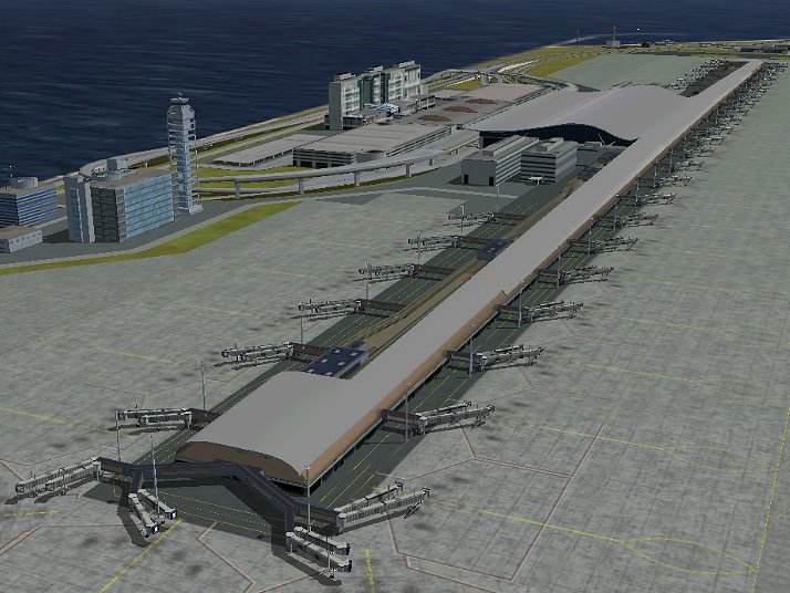 関西国際空港シーナリーは、新東京国際空港に次ぐ大作で、6作目になりました。 全長1,660mの優雅なターミナルの大きなトンネルのような内部(搭乗待合室のみ)も再現しています。 空港島内の建物は、ハンガーを初め、貨物倉庫、ケータリング施設、クリーンセンター、エネルギーセンターなど、ほとんど再現しています。 また、スカイゲートブリッジも、世界一のトラス橋のイメージを崩さないよう、出来うる限りの鉄骨を描画しました。 ブリッジを疾走する、JRの“はるか”や南海鉄道の“ラピード”も設置してあります。 りんくうタウンも、イラストシーナリーで、海岸線を修正して、りんくうゲートタワービル、観覧車、高速道路、田尻マリンブリッジなど一部の建物を製作しています。 張り切って作りすぎたおかげで、フレームレートが犠牲になってしまいました(笑)。 AI機を追及されている方には、不満になるかもしれません。