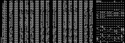 R8 テクスチャファイルは基本的にはヘッダー情報のない .bmp ファイルです。 上に示した複雑な16進コードは,テクスチャファイルをビットマップファイルに 変換するために R82BMP が付加するヘッダー情報の一部で,これによって, 標準的なビットマップエディタで開くことができるようになります。